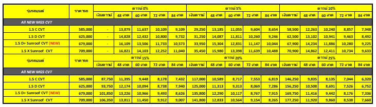 *หมายเหตุ : ข้อมูลตารางผ่อนดาวน์ MG5 ซึ่งเป็นข้อมูลคำนวณค่างวดราคารถยนต์ MG5 โดยประมาณไม่รวมดอกเบี้ย ณ. วันปัจจุบัน โปรดสอบถามรายละเอียดเงื่อนไขแคมเปญและอัตราดอกเบี้ยจากผู้จำหน่ายอีกครั้ง